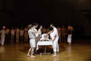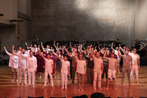 The Boys Choir Lucerne (men’s and boys’ voices) was expanded for this project with 25 experienced singers from the region. The requirement to sing the whole work by heart made the search a little more difficult than expected. In the end, 45 singers of different ages, as well as 18 boys, came to rehearse. Because the planned choreographies required a lot of space, this was the maximum. The choir singers were extremely well prepared musically by Andreas Wiedmer, the musical director of the BCL. Thus, already in the first rehearsals with Alessandro, the choreographic work could already start. During the rehearsal breaks, a lively exchange began between the conductors, both of whom are passionately committed to the promotion of young talent.